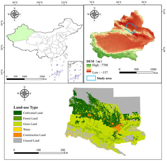 The Urumqi–Changji–Shihezi urban agglomeration (Figure 1 below) is one of the 19 critical urban clusters planned for urban cluster construction at the national level and one of the eight typical representative urban clusters identified in the Urban System Planning of Xinjiang Uygur Autonomous Region (2012–2030). The total area of the Urumqi–Changji–Shihezi urban agglomeration is 63,800 km2, with Urumqi as the “heart and brain”, its scope also includes Shihezi, Changji, Fukang, Wujiaqu, Shawan, and Hutubi County, Manas County, and other six cities and two counties, as well as the sixth division, the eighth division, and the twelfth division of the Corps.