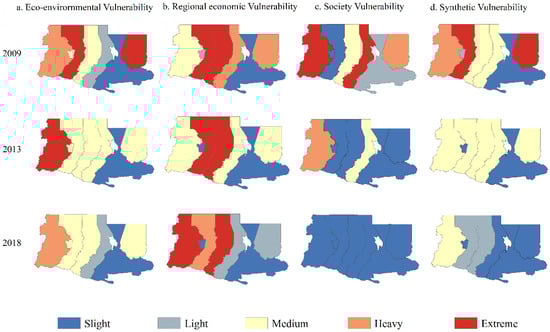 The vulnerability values of each region of the Urumqi–Changji–Shihezi urban agglomeration from 2009 to 2018 were spatially visualized using Arcgis 10.6 software and divided into three-time nodes—2009, 2013, and 2018—to obtain the spatial distribution of vulnerability levels in each region of the Urumqi–Changji–Shihezi urban agglomeration, as shown in Figure 3 below. From the figure, it can be found that the spatial pattern evolution trend of the vulnerability index changes of different systems in each region of the Urumqi–Changji–Shihezi urban agglomeration is as follows: overall, the difference of the spatial evolution pattern of the vulnerability index of ecological–economic–social systems in the Urumqi–Changji–Shihezi urban agglomeration changes from large to small, among which the change of regional economic vulnerability is smaller, and the change of social and ecological environmental vulnerability is larger.