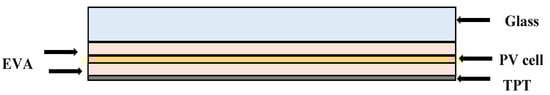 The PV system consists of a polycrystalline silicon cell and EVA (ethylene vinyl acetate) placed on the top and bottom of this cell, for which the top layer is glass, and the bottom layer is TPT (tedlar polyester tedlar), thus amounting to a total of five components [41]. Figure 1. presents the schematic diagram of the designed PV module.