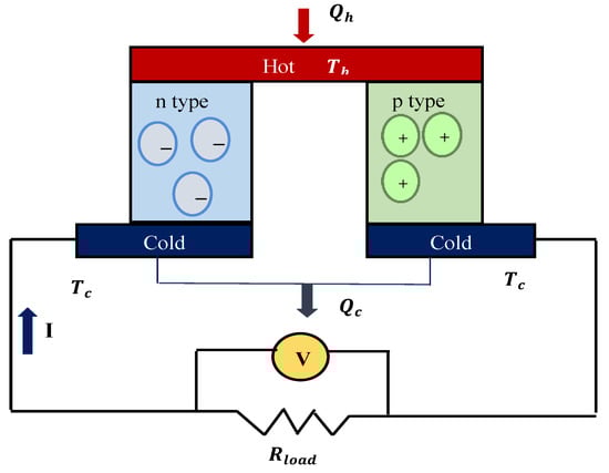 where V o p e n is the Seebeck voltage, and T h and T c are the hot and cold side temperatures, respectively. The coupling of this simple thermoelectric process with external load resistance facilitates current flow, resulting in the following output voltage [67]: