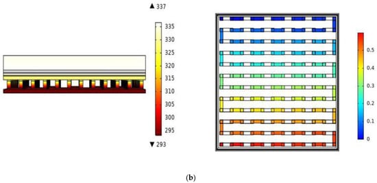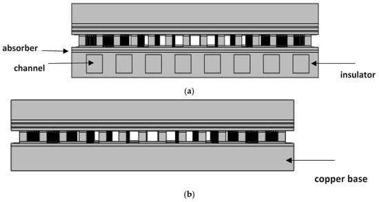 In the TEG model, the ceramic plates on the bottom and top sides are placed between the PV module as the heat source and between the channels where fluid flow takes place as the heat sink, and the temperature difference is converted into electrical power. When the previous studies were examined, an absorbent layer was placed between the TEG and the channels to ensure that the cooling process reached the desired levels. In addition, the channels are covered with an insulating material and the losses are minimized. In the modeling of the PV/TEG system, the temperature difference was precipitated by positioning the TEG on the copper base. The copper base acted as a heat sink. The design of the PV/TEG and PV/TEG–channel model is shown in Figure 3.