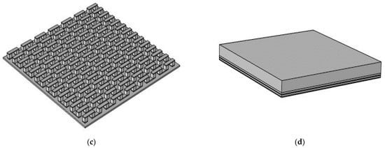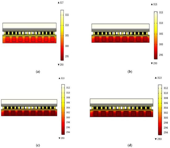 Figure 3. (a) PV/TEG–channel, (b) PV/TEG, (c) TEG, and (d) PV configurations.