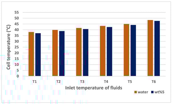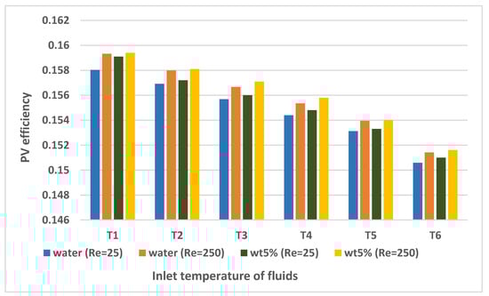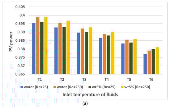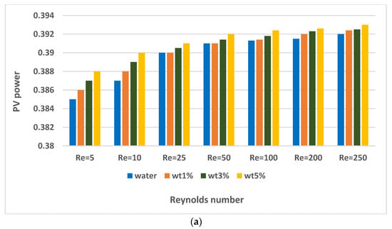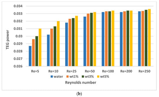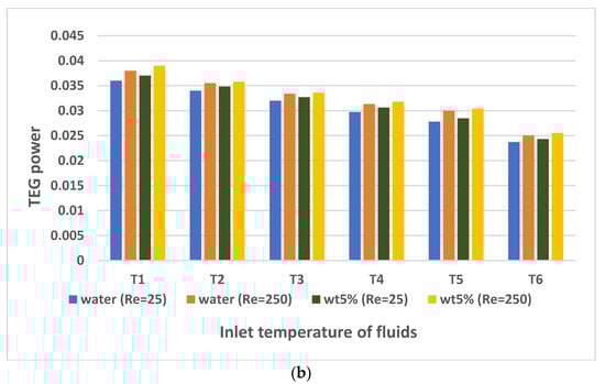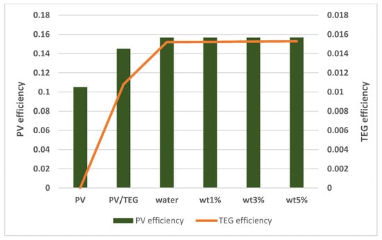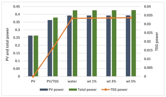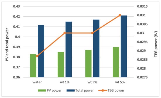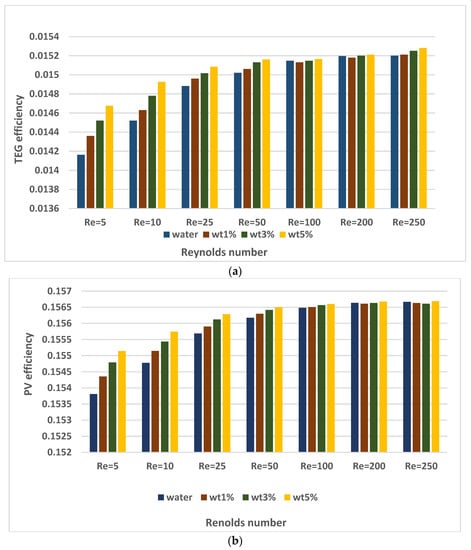 There are also many studies that include nanofluid applications in PV/TEG systems. Rajaee et al. [32] investigated the application of a C o 3 O 4 nanofluid (with 0.25, 0.5, and 1% volume fractions) and water in a PV/TEG system. They concluded that a 10.91% higher level of electric power generation was achieved with the C o 3 O 4 nanofluid (1% volume fraction) compared to water. Kolahan et al. [33] used an A l 2 O 3 /water nanofluid (0.2 wt%) in Photovoltaic thermal (PVT) generator and a PVT–TEG. They achieved the best energy efficiency ratio at the lowest mass flow rate of 0.001 kg/s (laminar flow). Although the electrical power produced in the PV cell was the same in both systems examined, the PVT–TEG hybrid system showed an enhancement of approximately 2.5–4% in electrical energy efficiency compared to the PVT system. Soltani et al. [34] investigated the effect of water-based F e 3 O 4 and Si O 2 nanofluids on a PV/TEG. The best results were obtained with the water-based Si O 2 nanofluid. Rajeb et al. [35] compared a concentrated photovoltaic thermal (CPVT)/TE nanofluid (0.5% water-based graphene) with CPVT/TE, CPVT/TE-water, and CPVT systems. They concluded that the exergy production with the CPVT/TE nanofluid and CPVT/TE-water systems increased by 4.88% and 0.68% compared to the CPVT system in summer conditions. Akbar et al. [36] compared the natural air flow properties using water, water-based Ag, and Si O 2 nanofluids in a PV/TE system. They achieved increases of 40.54%, 50.53%, and 18.23% in the total power of the PVT/TE compared to natural air flow with water-based Si O 2 , water-based Ag, and water, respectively. Some other studies that consider the effectiveness of using nanofluids for TEG, PV, and compound TEG + PV systems can be found in various sources [37,38,39,40]. The increment in the overall system performance depends upon the type of nanoparticle and its shape, the type of base fluid, and, more importantly, the loading amount in the base fluid.