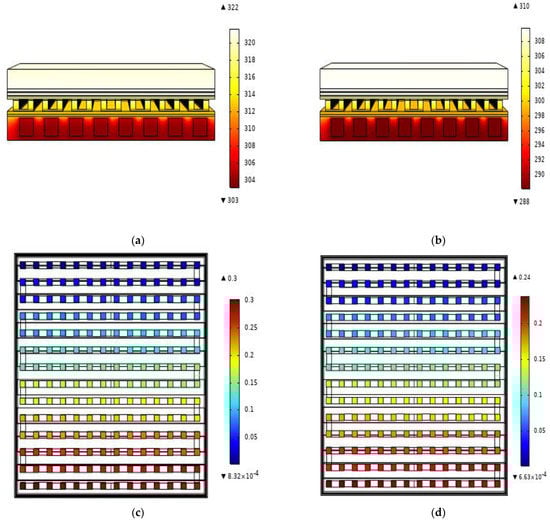 Since the electrical connection between the thermoelectric legs occurs via the electrodes, the electrodes are expected to have high electrical conductivity. In the model, we designed, copper (Cu), with high electrical conductivity, was considered the preferred choice of material for the electrodes. In the modeling of a TEG, the electrical conductivity of the ceramic layers providing electrical insulation should be low. In addition, these layers are in contact with the heat sink and heat source, rendering heat transfer performance an important parameter; accordingly, the materials must exhibit high thermal conductivity. Considering all these features, aluminum oxide ( A l 2 O 3 ) was used for the ceramic plates. The thermophysical properties of the materials that constitute TEG are presented in Table 2.