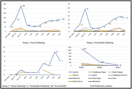 A sustainable marketing strategy should satisfy current demands without jeopardizing future resources. To achieve this objective, sustainable marketing involves economic growth, social responsibility, and environmental conservation. In addition, sustainable marketing places a premium on the triple bottom line, customer requirements, and long-term shareholder value. Based on an analysis of the SCOPUS database, it was determined that there remained a need to study the relationship between sustainable marketing (and green marketing) and social media [17]. The research period spanned from 1991 to 2022, utilizing press and archival sources. We began the procedure with the string selection; initially, two strings were chosen according to the necessity for investigation. There were 1801 documents identified, of which 1459 were on “Green Marketing” and the remaining 342 were on “Sustainable Marketing”, indicating the need for further study in this area. Therefore, the researchers investigated the concept of sustainable marketing in greater depth. Subsequent analysis revealed that combining sustainable marketing with social media provided a more realistic image of the research. On additional investigation, a third string was produced, for “Green Marketing” or “Sustainable Marketing” and “Social Media”, yielding more than 35 hits. Articles, conference papers, book chapters, review papers, books, conference reviews, editorials, and data papers accounted for 1836 documents. Figure 1 depicts the entire study scenario and research breadth on this topic. The study topic “Green Marketing” accounted for the highest proportion, at 79.5%, while the research topic “Sustainable Marketing” contributed 18.6%.