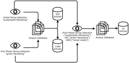 Firstly, the initial keywords like “sustainable marketing”, “green marketing”, and “social media” were selected for the experiment. String selection for running the query in the Scopus database was influenced by the guidelines given by Kitchenham and Charters [18]. Selecting a topic, developing research questions, and consulting with subject matter experts all inform the final set of keywords. While there are several possible sources for obtaining white papers, Scopus is widely recognized as the most comprehensive and valuable database [19]. For this reason, the Scopus database was accessed to obtain a large sample of authors. Finally, the graphic displays the corpus collection procedure using many Scopus strings (Figure 2).