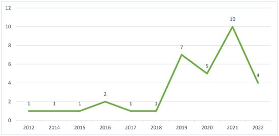 After assessing the general trends of publications and citations, a detailed analysis of the selected publications was conducted. Two tables (Table 2 and Table 3) were created to provide the top 5 publications and citations across three parameters: countries, authors, and journals. The USA leads the field in numbers of publications (six) and citations (135). Sustainability (Switzerland) leads the list of journals, with nine publications. The Journal of Advertising is the clear winner for the number of citations (117). Among the authors surveyed in the study, Minton E., Lee C., Orth U., Kim C.-H., and Kahle L. (117 each) lead the citations (all having co-authored the top-cited paper). Katsonis N., Szymoniuk B., and Tsekouropoulos G. have the most publications, with two each. Figure 4 shows the annual numbers of publications in this area since 2012. It can be observed that the annual output of contributed papers has been trending upward, and 2021 was the most productive year, with 10 publications.