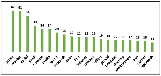After the general analysis of the shortlisted publications, VOS viewer was used to visualize the co-occurrence of author keywords within studies. This was carried out to assess the specific focus areas of the authors, who used a total of 145 keywords in the publications. The top keywords were: social media (13), followed by green marketing (8), sustainable marketing (6), sustainability (5), and marketing (4). Figure 5 visualizes the keywords along with the co-occurrences. The 145 author keywords were grouped into 21 clusters.