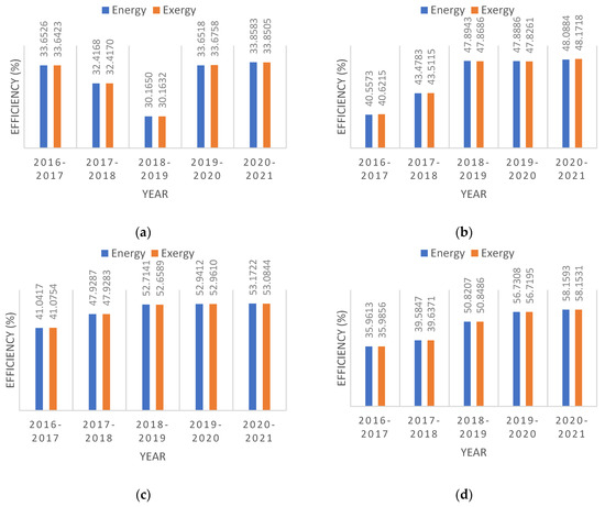Energy and exergy efficiencies of different units calculated during 2016–2021 (a) Units 3, 4, and 5, each 150 MW, (b) 225 MW CCPP, (c) 450 MW CCPP South, (d) 450 MW CCPP North.