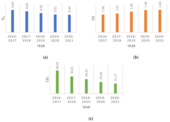 All the sustainable indicators are calculated using formulas explained and shown in the parameters for the analysis section. In Figure 4, DN, ESI, and CEL are shown. The depletion number indicates how much fuel is depleted in a system. Old technology and instruments are mainly responsible for high depletion numbers. During 2016–2017, APSCL had a high depletion number of around 0.63. It indicates 63% of the fuel is depleted in the plants. The value became 0.50 in 2020–2021, which made the system’s fuel depletion rate lower, and a lower DN is preferred for sustainable power generation.