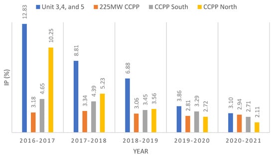 The value of improvement potential (IP) is shown in Figure 6. IP varies by 12.83–3.10, 3.18–2.94, 4.65–2.71, 10.25–2.11 for Units 3, 4, and 5, 225 MW CCPP, CCPP South, and CCPP North, respectively. The values clearly show that APSCL is improving its system, and all the values indicate higher sustainability. It is evident from Figure 6 that IP has changed over the years.