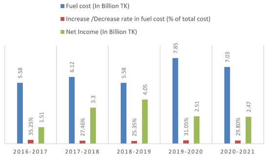 Figure 7 shows that fuel costs have increased over the years in the APSCL. The financial year 2019–2020 had the highest fuel cost, around 7.85 billion [24], while the costs for this were 31.05% of the total company’s cost compared to the previous year, thus the company’s net income was around 2.51 billion TK for the year. During 2020–2021, costs decreased by 29.80%, and net income was around 2.47 million TK. It is noticeable from Figure 7 that a significant portion of the cost of power plants is fuel cost. The reason for the vast fuel price and its increasing/decreasing rate, and consequently companies’ income, depends on the electricity demand and the electricity rate.