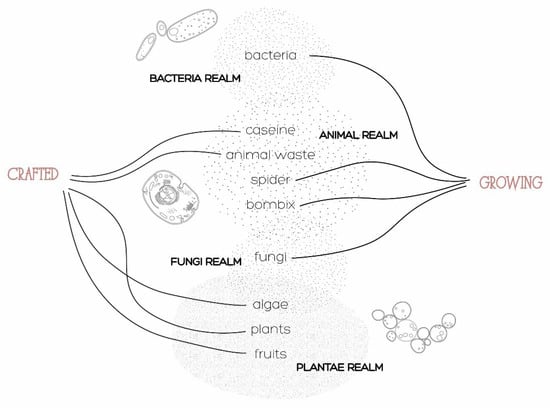 Speculating on these three kinds of biomaterial kingdoms, an important process difference comes out that divides them: the growing and the crafting actions. The growing process is about the idea cultivation rather than construction. The growth envisions a time dedicated to the replication of the organisms which autonomously generate the material. Crafting is then mainly an action belonging to human fabrication and concerns a sequence of hand-made actions in the mixing of the components involved in the process (Figure 1).