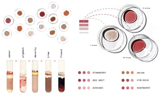 Among them, we dyed with strawberries, raspberries, onions, hibiscus, avocados, and red beets, to find interesting and innovative shades of pigment. For each natural substance, we used the same procedure, adjusting these four factors differently: the amount of water (mL), the amount of pigment (density), the amount of time (minutes), and the addition of a fixative. From these tests, we created different tints and used them, depending on their degree of conformity, as a kind of palette for the bioskins we simultaneously constructed. Their combinations generated results that were as unexpected as they were unusual, due to the beauty of the shades generated, the result of a unique, bio-based interaction (Figure 2).