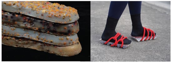 The Skin of Nature (Skin of Nature, designed by Wei Qianjie, Yang Yanbin, Zhang Jinwen. A complete description of the project is available at our research lab website https://ecology.shanghai-visual.org/web/skin-of-nature/ (accessed on 8 March 2023)) has led to a rethinking of the relationship between humans and nature. Instead of through industrial manufacturing, people are learning from nature by recycling and planting to create wearable products. In the future, the byproducts of planting could be further processed, while retaining their epidermal biological characteristics, to become biological materials as a second skin for humans, reducing the use of animal leather and thus reducing environmental pollution and harm to animals. The second scenario looks instead at the built environment in the city [20]. Whilst the Skin of Nature creates tactile hybrids, the project named Unintentional Urban Mutualism (UUM) (designed by Lu Wentao, Wu Yichen, Liu Yingxuan) speculates on the possibility of urban infrastructures that support multispecies city dwellers. Many natural elements we encounter in urban areas are maintained, influenced, and manipulated by humans, such as plants in our pots, green areas along roads, and pets we keep in our homes. Meanwhile, there is much different urban nature, like sprouts out of cracks, moss in corners, birds in holes, insects in books, shadows on concrete objects, falling away from human intentionality, yet falling short of their control; these urban natural elements are not manipulated, and they appear surprising, vibrant, and uniquely natural. They convey the presence of nature all around us, spilling over the protocols of our interventions and the regulations of the built environment of cities. What if this mutuality would be a principle to build unintentional multispecies interaction? The scenario speculates that an 18th Sustainable Development Goal (SDG) of UUM would protect these forms of urban nature, would support citizens in acts of noticing and appreciation, and would be considered a cornerstone element of urban fabric. SDGs are moved forward by targets, and UUM has them as well, for example, to support urban plants spreading farther and prospering unintentionally. Within UUM framework, the SEEDIDAS project (Figure 5) pioneers blended seeds from urban plants into a bioplastic made of agar and then moulded into shoe soles. In daily use, seeds in the soles will drop off randomly as the soles gradually wear off. The bioplastic will decompose in a few days and the seeds will sprout and prosper.
