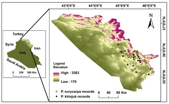 Multiple surveys were carried out in the Sulaimani Governorate between 14 July and 25 December 2021 to obtain the presence data for both species. These data were gathered using the stratum sampling technique [41]. The villagers’ expertise and Flora of Iraq [3], together with a handbook guide, have all been crucial in identifying and gathering the data. Each sample record was visited, looked through, photographed, and herbarium-ready (Figure A1). Plant phenotypes (observable characteristics) were used in this research to recognize and classify both species. Moreover, 161 GPS ground records (P. eurycarpa = 89, P. khinjuk = 72) were initially collected as a result of the survey efforts. Based on Boakes, et al. [42], geographical filtering of 1 km was performed to the dataset to minimize the spatial autocorrelation between the sites. This resulted in a reduction of the points of sample to 135 records (n = 78 and n = 57, for both species). Applying the spatial filtering approach is beneficial in reducing sample error and improving the variability of the altitudinal differences among the sites [43]. For the spatial filtering and quality verification, the extended SDMtoolbox 2.5 and ArcGIS 10.3 (ESRI, Redland, CA, USA) software were used [44].