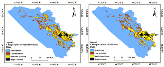 The MaxEnt model was chosen due to its ability to produce results that are comparable to those of presence–absence model approaches and presence-only dependent model types [34], as well as its superior predictive accuracy when compared with other approaches [32,57]. For P. eurycarpa and P. khinjuk, 70% of the presence data points were used to train the models, while the remaining 30% were used for model validation. In this investigation, the algorithm iterations maximum number was 500, with the choice of model replicate set to 10 (maximum entropy). The 10 model replicate option yields average habitat suitability maps for P. khinjuk and P. eurycarpa. To account for the species’ presence records (n = 78 and n = 57, respectively), the background points were adjusted to 570 [30]. The multiplier of regularization was adjusted to 1 [34]. Tuning the regularization multiplier may change how complicated or simple the model is. For example, raising the number above one makes the model simpler, while lowering the value below one makes the model more complex [58]. The jackknife test was also used, for assessing the factors’ relative significance and contributions to the likelihood of distribution of species’ habitats [59]. Additionally, from 10 model outputs (10 repetitions) the value of average (i.e., the value of the threshold) was utilized to define the likelihood of unsuitable distribution and habitat suitability for these species (occurrences probability) [60]. For P. eurycarpa and P. khinjuk distribution, pixels with values equal to or greater than 0.3 were deemed appropriate regions, whilst pixels with values lower than 0.3 were considered unsuitable areas. According to these threshold values, the suitability maps for the two species were classified as follows: high suitability (0.67–0.89), medium suitability (0.45–0.67), low suitability (0.3–0.45), and unsuitable (0–0.3) [61] (Figure 3). The ArcGIS 10.3 platform’s spatial analysis toolbox was employed to conduct these operations.