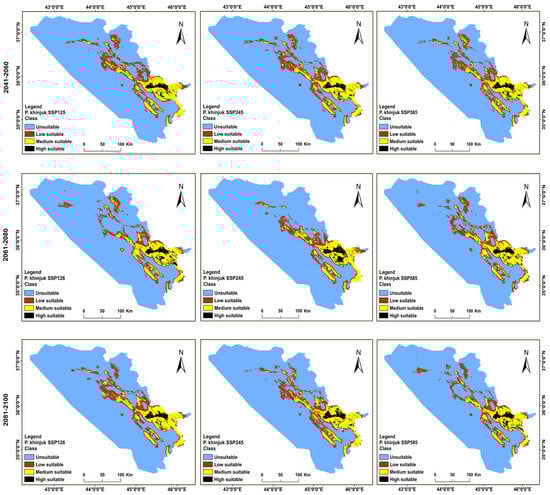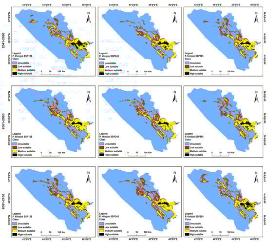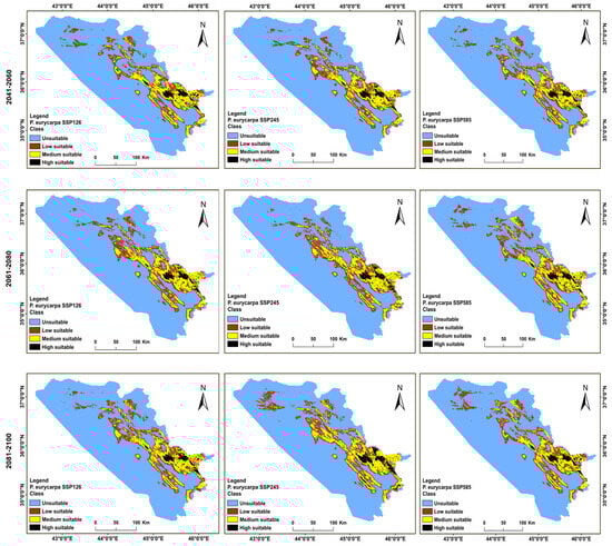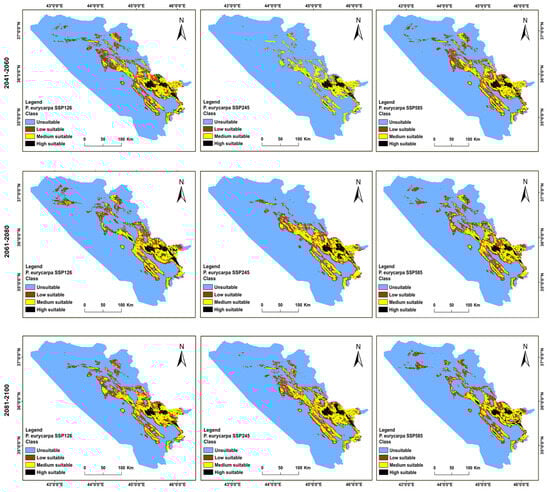Distributions for the future habitat of P. eurycarpa under (SSP 585, 245, and 126) climate change scenarios in the BCC-CSM2-MR model in the years 2041–2060, 2061–2080, and 2081–2100 in the KRI.