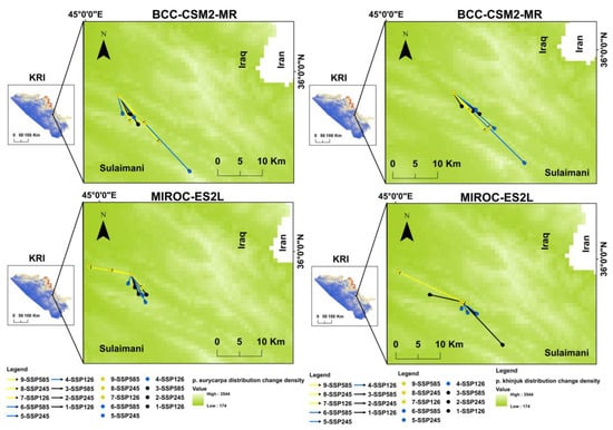 Change density (magnitude) of the distribution and the centroid (core) direction of P. eurycarpa (left) and P. khinjuk (right). The arrowhead = the distribution change direction under the given scenarios. The time windows of 2041–2060, 2061–2080, and 2081–2100 are shown in black, blue, and yellow color arrows in the figure, respectively.