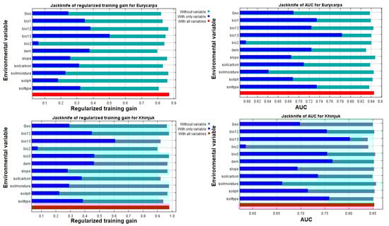 The jackknife test for environmental factors significance, the AUC metric gain (%), and regularizing training gain (%) for P. eurycarpa (top) and P. khinjuk (bottom).