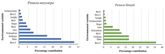 Contribution of the variables to the distribution probability of both P. khinjuk (right) and P. eurycarpa (left) in the KRI.