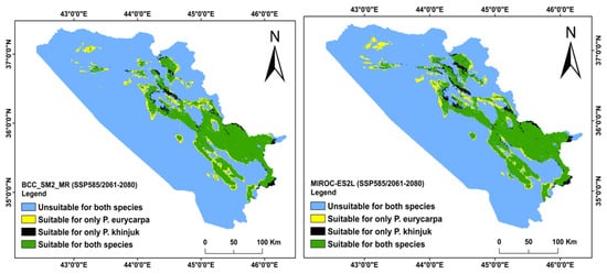 One of the most urgent environmental challenges confronting mankind at the moment is global climate change. The average worldwide surface air temperature rose by 0.76 °C between 1850 and 2005. This indicates a trend of warming in the past 50 years of 0.13 °C per decade [28]. Between 2030 and 2052, if global warming keeps at its present pace, there will likely be a 1.5 °C increase [64]. Many plants are anticipated to adapt to the rapid temperature rise and spread to new areas. Climatic change has had a substantial impact on species distribution and abundance during the last several decades, and under future climate scenarios, it also causes species extinction, a shift in demography, a shift in phenology, expansion, contraction, and differences in growth and productivity [65]. According to Monzón, et al. [66], species ranges related to climate change are likely to grow or contract, and some species may even need to relocate to take advantage of new environments. According to earlier research, species contraction and plant habitat loss were anticipated to occur in the KRI [67], Africa [68], and California [69]. Different plant species also react differently to the predicted climatic circumstances. Nevertheless, other research, has indicated that, in several countries, including the Marion Island [70], Spain [71], the southern United States [72], and Indonesia [73], plant species’ habitats are expanding due to anticipated climate change. Our results also indicate that under the two GCMs, the BCC-CSM2-MR and the MIROC-ES2L models, and for the majority of the SSP climate change scenarios, the overall habit range of both species would expand. For the two GCMs the species habitat range would overlap by 8812 km2 (17.25%) and 9177 km2 (17.96%), respectively. The modeling revealed a total habitat suitability rise over a habitat suitability decline in the future circumstances. The modeling of BCC-CSM2-MR, for instance, under scenarios of SSP 245/2041–2060 and SSP 585/2041–2060, presented the maximum gain in habitat suitability for P. khinjuk and P. eurycarpa. Both species’ habitat appropriateness is predicted to move from the present 9230 km2 (18.06%) to the future 9735 km2 (19.05%), and from the present 10,442 km2 (20.43%) to the future 11,047 km2 (21.61%), respectively. In a similar way, the scenarios of the MIROC-ES2L modeling for the two species resulted in a comparative finding regarding habitat suitability gain. P. khinjuk is predicted to expand from the current 9230 km2 (18.06%) to 10,769 km2 (21.07%) under SSP 585/2081–2100, in the future; whereas, P. eurycarpa, under SSP 585/2081–2100 was seen to move from the current 10,442 km2 (20.43%) to 11,210 km2 (21.94%) in the future (Table A1 and Table A2). Moreover, the expansion of eminent habitat (the expansion–contraction net percentage) findings are predicted to increase in both modeling scenarios, MIROC-ES2L and BCC-CSM2-MR. The expansion in BCC-CSM2-MR will be as follows: P. khinjuk expands by 504 km2 (0.986%) under SSP 245/2041–2060 and P. eurycarpa grows by 606 km2 under SSP 585/2041–2060 (1.186%); whereas, P. khinjuk expands by 1539 km2 (3.012%) under SSP 585/2081–2100 and P. eurycarpa expands by 1683 km2 (3.294%) under SSP 245/2081–2100, when using MIROC-ES2L modeling scenarios (Table A3 and Table A4).