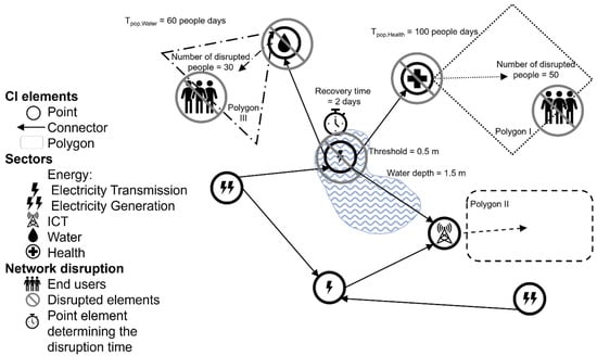 Figure 2 shows a basic CI network model with one inundated CI structure from the energy sector in the centre, as replicated from the calculation. From there, cascading effects transmit the disruption to two point elements in the water and health sector and subsequently their connected polygon elements. The polygon elements are associated with a number of end-users. If there is disruption, this determines the number of disrupted people per sector Pdis,sec [people]. The recovery time of the centre element indicates the time of disruption tsec [s] for the other network elements. Based on [18,21] a combination of Pdis,sec and tsec of all end-user elements per sector e results in the population time per sector TPop [people · s]: