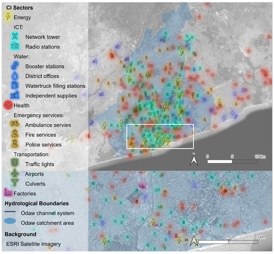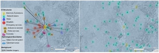 - Schotten, R.; Bachmann, D. Methodology of a Critical Infrastructure Network Modelling Module for Flood Risk Assessments Including a Case Study in Accra, Ghana. J. Flood Risk Manag. 2022, submitted.