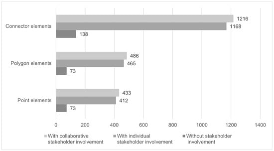 The CI network model shown Figure 5 evolved in steps, resulting in three versions of the model. The first version (V1) was generated with no stakeholder interaction and was derived from publicly available data such as OpenStreetMaps and other web mapping services [67]. The second version (V2) is a modified version including feedback from individual stakeholder interaction based on interviews. The third version (V3) was derived from feedback from a collaborative stakeholder participation meeting involving the CIrcle method. This stakeholder participation meeting was organised in the form of a CIrcle workshop, as described above (see Section 3.5). Figure 6 shows how the different participation levels raised the number of CI network elements, which underlines the benefit of involving CI stakeholders in the FRA. Additionally, the model versions including individual and collaborative stakeholder involvement do not vary greatly by the number of CI network elements but by the quality and relevance to the CI stakeholders. The point elements added to the third CI network model version are highlighted as particularly relevant to the CI stakeholders during the participatory sessions. An example for this case study are three major radio stations, which were identified during the workshop and are also placed close to the Odaw main channel. They have been highlighted as an important tool of information for the public as well as for the emergency services. Additionally, the most relevant factories in the centre of the area of investigation have been added. For the analysis of the CI network, they play a minor role, but they were included at the request of the CIrcle workshop participants.