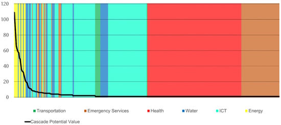 After the assembly of the CI model, network characteristics are used to describe its characteristics. Figure 7 gives an overview of all point elements on the x-axis. The background colours relate to the corresponding CI sectors which are included in this CI network model: electricity, emergency responders, health, fresh water, transportation hubs and telecommunications. The y-axis represents the cascade potential value p, which quantifies the number of end user elements in the CI network disrupted by a failure of this specific point element. The point elements are ranked from the highest p to the lowest. The electricity and the water sectors have the highest p values since they are connected to many more final CI elements that are at the receiving end of a cascade, such as health, the emergency services and the transportation sector, whose points have the lowest p within this model’s arrangement. The telecommunications sector is to be found in areas with both high and low p values. The p values characterise the CI network and can help to identify potential sectors and structures for mitigation measures.
