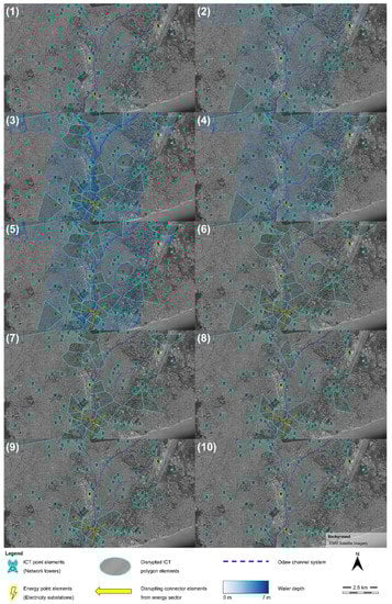 Time steps of CI disruptions in a part of the Odaw catchment. Figure partitions 1–10 summarise the order in which the CI point and polygon elements from the ICT sector are disrupted. Energy point elements disrupted transmit the disruption to other ICT point elements. Blue cells in the background indicate a water depth, derived from the hydraulic model for every time step.