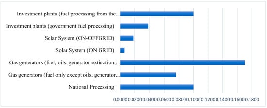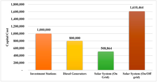 First, we determined the operating costs of diesel generators by calculating how much it would cost to run generators with a 1 Mwt output 24 h a day. When compared to other sources of power generation, solar energy’s operational costs are significantly lower than those of the government (81%), diesel generators (75%), and investment stations (51%) [64]. Operating the system exclusively during daylight hours and without reliance on batteries reduces operational and capital expenses for the solar system by less than half; here, batteries are the critical element in raising the prices of solar capital and operational systems (Table 4 and Figure 3).