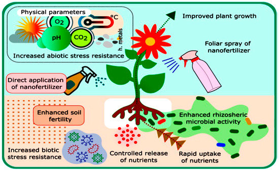 As a result, nanofertilizers have the potential to vastly boost crop growth and yields, increase fertilizer efficiency, cut down on nutrient losses, and lessen their adverse effects on the environment compared to traditional fertilizers [78].