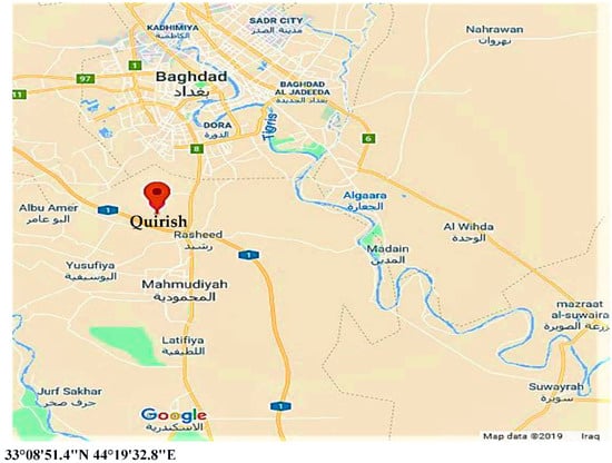 Quirish is one of the villages located in the Al-Rasheed district in the Baghdad governorate. The Al-Rasheed district is regarded as one of Baghdad’s most important agricultural areas (Figure 5). The total area is 24,683 ha. About 18,405 ha are cultivation areas in the district; these areas are exploited by planting various vegetable crops. Cucumber is the most important crop grown in the region, accounting for roughly 90% of total crop production, along with tomatoes, okra, eggplant, peas, melons, dates, and citrus. Most farmers are adopting a protected agriculture pattern by using greenhouses [81].