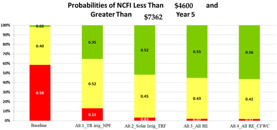 To demonstrate the full potential of these new technologies, we first assumed complete adoption of the alternative agricultural technologies (alternative scenarios) modeled in this study in crop production and water irrigation. Farmers’ concerns about acquiring irrigation instruments such as solar pumps due to the high capital cost were partially addressed by making loans accessible to farmers to purchase solar irrigation pumps through the Agricultural Cooperative Bank of Iraq. Regarding nanofertilizer-related crop production technology, we estimated a 60% adoption rate, which is double the initial adoption rate from the household data survey (30%).