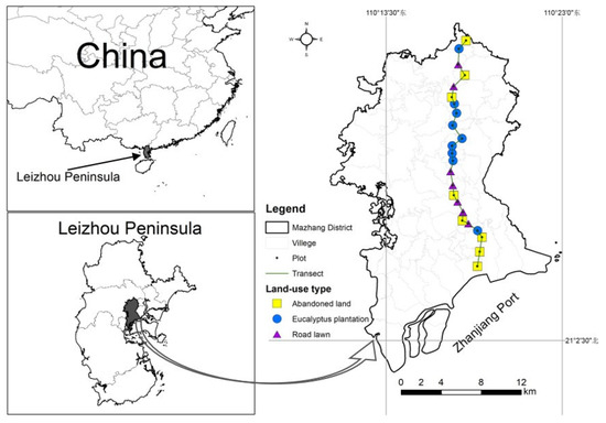 From the south to the north of the main road (Shugang Dadao) of the Mazhang District (21°06′29.8″~21°18′41.8″ N, 110°18′25.8″~110°17′48.7″ E), in the northeastern part of the Leizhou Peninsula, an approximate 23 km belt transect was set up, with 24 sampling sites and 3 land uses, including abandoned land (AL), eucalyptus plantation (EP), and road lawn (RL) (Table 1), referring to the methods in previous studies [34,35]. The above three land-use types are not only the primary land-use types of this main road, but also represent the major land-use types around the road network in the Leizhou Peninsula. The distance of each sampling site is about 0.6~1.4 km, avoiding roads, buildings, and water bodies. EPs in this area adopt standard operation modes, such as machine cultivation, ditching, land preparation, base fertilizer application, enhanced weeding, topdressing, etc., with a 3~4 year cutting cycle. ALs were distributed sporadically with Casuarina equisetifolia, Melia azedarach, Litsea glutinosa, and Delonix regia, as a secondary succession. RLs were covered by turfgrass, which is not allowed to be trampled, managed by the Bureau of Parks and Forestry, with unified fertilization, irrigation and mowing cycles.