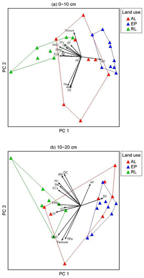 Principal component analysis (PCA) was used to show the distribution of soil physicochemical properties, which was OC, TN, TP, TK, AN, AP, AK, ECa, EMg, BD, NWC, TPo, and texture, among different land uses. PCA was performed with the cross-product matrix of correlation and calculated scores for variables of the distance-based biplot, with a 999-run randomization test through PC-ORD version 6.0 [42].