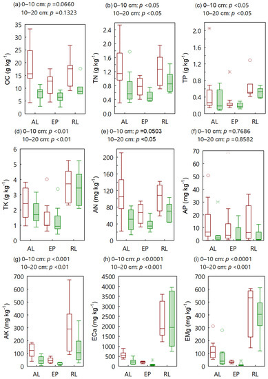 At the 0–10 and 10–20 cm depths, TN, TP, TK, AK, ECa, and EMg showed significant differences (p < 0.05) among the three land uses, and presented the descending order of RL > AL > EP (Figure 3b–d,g–i). AN showed only a marginal difference among the land uses at the 0–10 cm depth, but indicated a significant difference (p < 0.05) at the 10–20 cm depth (Figure 3e). OC and AP showed no significant differences at the 0–10 and 10–20 cm depths (Figure 3a,f). The TK, AK, ECa, and EMg of RL were much higher than those of the other two land uses. Compared with other land uses, each soil chemical property of EP was relatively concentrated.
