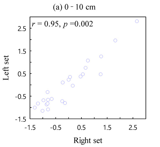 Scatter plot of the canonical correlation analysis (CCA) between the left set and right set. Left set includes 9 variables, which are organic carbon, total nitrogen, total phosphorus, total potassium, available nitrogen, available phosphorus, available potassium, exchangeable calcium, and exchangeable magnesium. Right set includes 3 variables, which are bulk density, natural water content, and total porosity.
