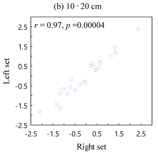 Soil samples were air-dried, subjected to gentle grinding, sieved to 2.0 mm, and then kept at room temperature until subject to analysis. The particle size distribution was determined by the hydrometer method, dispersed in sodium hexametaphosphate [36], and used in soil texture classification, including sandy loam, clay loam, and silty loam. Bulk density (BD) was measured by metal cylinders of approximately 100 cm3 volume, with samples taken from the 0 to 10 cm and 10 to 20 cm soil layers, respectively, with six replicated samples taken from each plot. Natural water content (NWC) was determined by the oven drying method, with samples weighed and dried (105 °C) until they reached a constant weight. Total porosity (TPo) was calculated from BD: TPo (%) = (1–BD/PD) × 100%, where PD = particle density. Particle density was assumed to be 2.65 g cm−3.