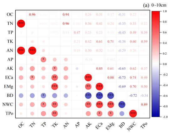 Correlation analysis between soil physicochemical properties (* p < 0.05; ** p < 0.01; *** p < 0.001). OC: organic carbon; TN: total nitrogen; TP: total phosphorus; TK: total potassium; AN: available nitrogen; AP: available phosphorus; AK: available phosphorus; ECa: exchangeable calcium; EMg: exchangeable magnesium; BD: bulk density; NWC: natural water content; TPo: total porosity. The numbers represent the correlation coefficients. Red and blue denote positive and negative correlations, respectively.