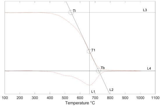 Each preground sample (ca. 10 mg) was loaded into a 90 μL alumina crucible and placed into a LABSYS evo STA 1600 (Setaram). A second empty crucible within the STA enabled the measurement of the heat flow within the sample. The STA heated the samples to 110 °C to ensure dryness, after which the temperature was ramped to 1000 °C, at heating rates of 5, 10, 15, 20 and 25 °C/min in an air atmosphere, to measure the burnout kinetics. The combustion temperatures were found using an academically accepted [,,] graphical method (Figure 1) that relates the mass loss (TG) and derivative mass loss (dTG) signals. A vertical line (L1) was drawn at the peak of the dTG signal until it intersected the TGA signal. A tangential line (L2) to the TGA signal was then drawn from this point. After this, two horizontal lines were drawn parallel to the maxima (L3) and minima (L4) of the TG. The intersection of L1 and L2 is the temperature at which the maximum rate of mass loss occurs (T1), the intersection of L2 and L3 is the burnout temperature (Tb) and the intersection of L2 and L4 is the ignition temperature (Ti).