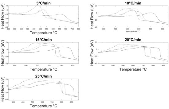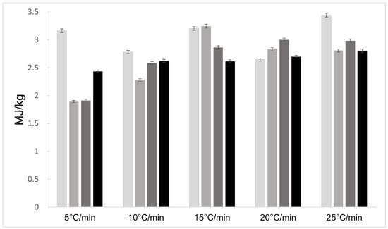 Figure 2 shows the heat flow, measured between an empty reference crucible and the crucible containing the sample, from the same series of samples measured across the main combustion process at different ramp rates (from 5 to 25 °C/min). Firstly, there is a significant difference in the energy values measured by the STA method (1.8–3.5 MJ/kg) compared with those measured by bomb calorimetry. In part, this can be explained by the fact that the STA values relate to only the most rapid part of combustion, whilst the bomb calorimetry includes the whole process. However, it also reflects the fact that STA measures the heat released from the sample using a thermocouple located beneath the alumina sample holder, whereas the bomb calorimeter is entirely surrounded by a water-filled jacket, which means that every photon of infrared radiation (i.e., all the heat) released contributes to the CV data. As such, whilst STA data are very useful for understanding which thermal ranges heat is released in, bomb calorimetry provides more accurate data on the total heat released. Alternatively, if the quantum yield of the infrared radiation harvesting within the bomb calorimeter is close to 100% because of the high efficiency of the heat absorption of water, then the quantum yield within the STA is somewhere between 10 and 15%. The efficiency of the heat absorption by water relates to the change in the dipoles of the water molecules during the transition, which makes this a high-probability process. This is also why water is such an efficient greenhouse gas. Interestingly, Figure 2 shows lower heat flow for the anthracite sample at 15–25 °C/min ramp rates, despite having the highest CV. The increase in the heat flow observed with increasing ramp rate is normal for DSC-based measurements, in which the heat-flow measurement is based on the differences in temperature between the sample and reference, which are both held in the same furnace. Thus, a faster furnace ramp rate heats the sample faster and, therefore, any exothermic or endothermic event takes place more rapidly, which creates a larger temperature difference between the sample and reference, resulting in a larger heat flow. A combination of heat flow and dTG can be seen in Figure A1.
