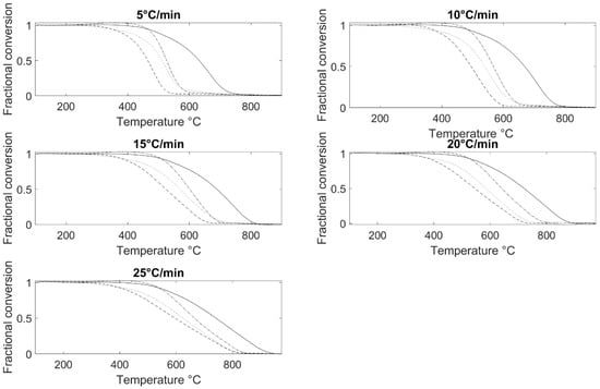Conversion data for each fuel at increasing heating rates versus temperature for each fuel. Dashed line: ecoke®(A); dotted line: ecoke®(B); solid line: PT breeze; dotted dashed line: Coal A.