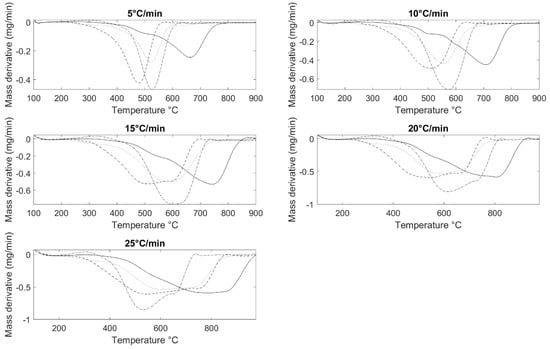 Kinetic analysis is important, as the ignition time can be optimised based on the activation energy, thus increasing the efficiency of the process. The kinetic parameters were calculated using AKTS thermokinetics software from the mass loss (TG) and differential mass loss (dTG) data according to the method described in []. The model-free differential isoconversional methods of Friedman and Ozawa–Flynn–Wall were used, as they are reliable methods of calculating the activation energy and enable analysis over the entire range of conversion []. These model-free differential isoconversional methods calculated the kinetic parameters using the Arrhenius Equation (4), where α is the fractional conversion, β is the heating rate, A is the pre-exponential factor, Eact is the activation energy, R is the universal gas constant and T is the temperature at time (t). The basis of the differential isoconversional method is that the kinetic parameters are independent of the heating rate: