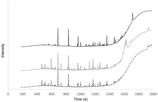 py-GCMS spectrum obtained at heating rate from 20 °C/ms to 800 °C. Dashed line is ecoke®(A), dotted line is ecoke®(B) and solid line is PT breeze.