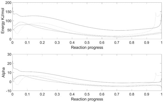 Therefore, there are a large number of variables to consider when selecting a fuel to form high-quality sinter. However, firstly, a fuel must be known to release sufficient energy to achieve the required temperatures. In this context, thermogravimetry is a highly developed technique to characterise fuels, with 8100 recent citations related to fuel production and characterisation using thermogravimetry [,]. The kinetic analysis of thermogravimetric analysis (TGA) data calculates the parameters: the activation energy (Ea) and pre-exponential factor (A). Traditionally, this has been performed by fitting the data to a predefined model, which is known as the model-fitting method. Vyazovkin and Wight [] found that this method works well for isothermal data but produces inaccurate values from nonisothermal data. This has led to the development of the isoconversional method, which does not assume a reaction model. This removes any errors occurring from the assumption of the wrong model. Additionally, due to not assuming the consistency of the Eact and A, a plot of the change in the Eact and A versus conversion can be made [].