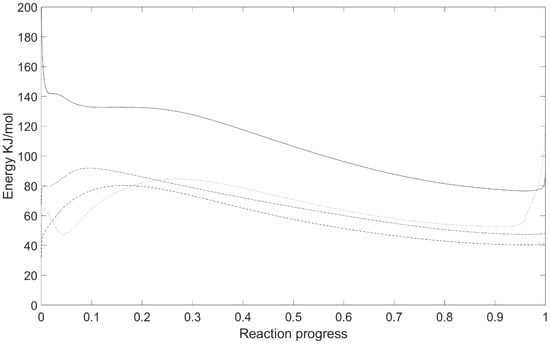 The model-free methods used did not assume a reaction model or consistent value for the Eact or A, but instead manipulated Equation (4) to calculate the kinetic parameters []. For example, the Friedman method [] plotted ln(dα/dt) against 1/T for a set of heating rates (β). At each conversion, a straight line was plotted with a gradient of Eact/R and an intercept of A, as per Equation (5). The Flynn–Wall–Ozawa method [,] plotted ln(β) against 1/T for different heating rates, as per Equation (6). Using this plot, straight lines at a constant α, gave the activation energy (the Eact from the gradient and the Arrhenius constant (A) from the intercept):