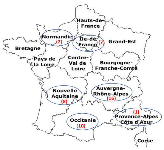 In Figure 2, the respective regions of origin are depicted. The overwhelming majority of initiatives found are located in the South of France. In total, 16 out of the 44 businesses are settled within Auvergne-Rhône-Alpes, 10 in Occitanie, 8 in Nouvelle-Aquitaine, 7 in Île-de-France, 2 in Normandie and 1 in Provence-Alpes Côte-d’Azur. Thus, only 6 of the 13 metropolitan regions in France are represented. The reason that these regions in particular are presented has to do with the fact that the economiecirculaire.org platform—used for the search—is linked to their regional circular economy platforms (except Nouvelle-Aquitaine). Roughly half of the enterprises are located in rural areas. They mostly manage large amounts of agricultural waste and by-products, often for biogas production. The other enterprises are active in an urban or periurban environment, especially the ones dealing with food redistribution, urban biowaste valorization into compost, or co-products from breweries.