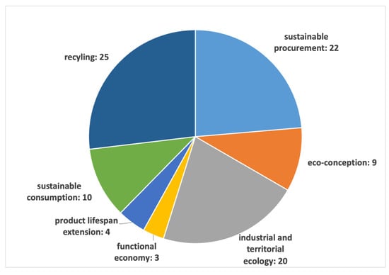 The French bioeconomy approach is also characterized as being participatory because it is based on multi-actor collaborations of different stakeholders (enterprises, public actors, NGOs, academics, and citizens) involved in the decision-making processes and implementation of projects [17]. The collaborative multi-stakeholder approach also served to establish the 2017–2018 Roadmap for the Circular Economy in France. The French Agency for the Environment and Ecological Transition, ADEME (l’Agence de l’Environnement et de la Maîtrise de l’Energie), provided valuable input [19] by dividing the different action domains of the circular economy into seven interrelated pillars. These pillars are grouped into three phases, production, consumption and end-of-life, as follows: (i) sustainable procurement, eco-design, industrial and territorial ecology, and functional economy, which are mainly considered in the production phase; (ii) responsible consumption and the extension of the life of products, during the consumption phase; and (iii) recycling and energy recovery, at the end-of-life phase.